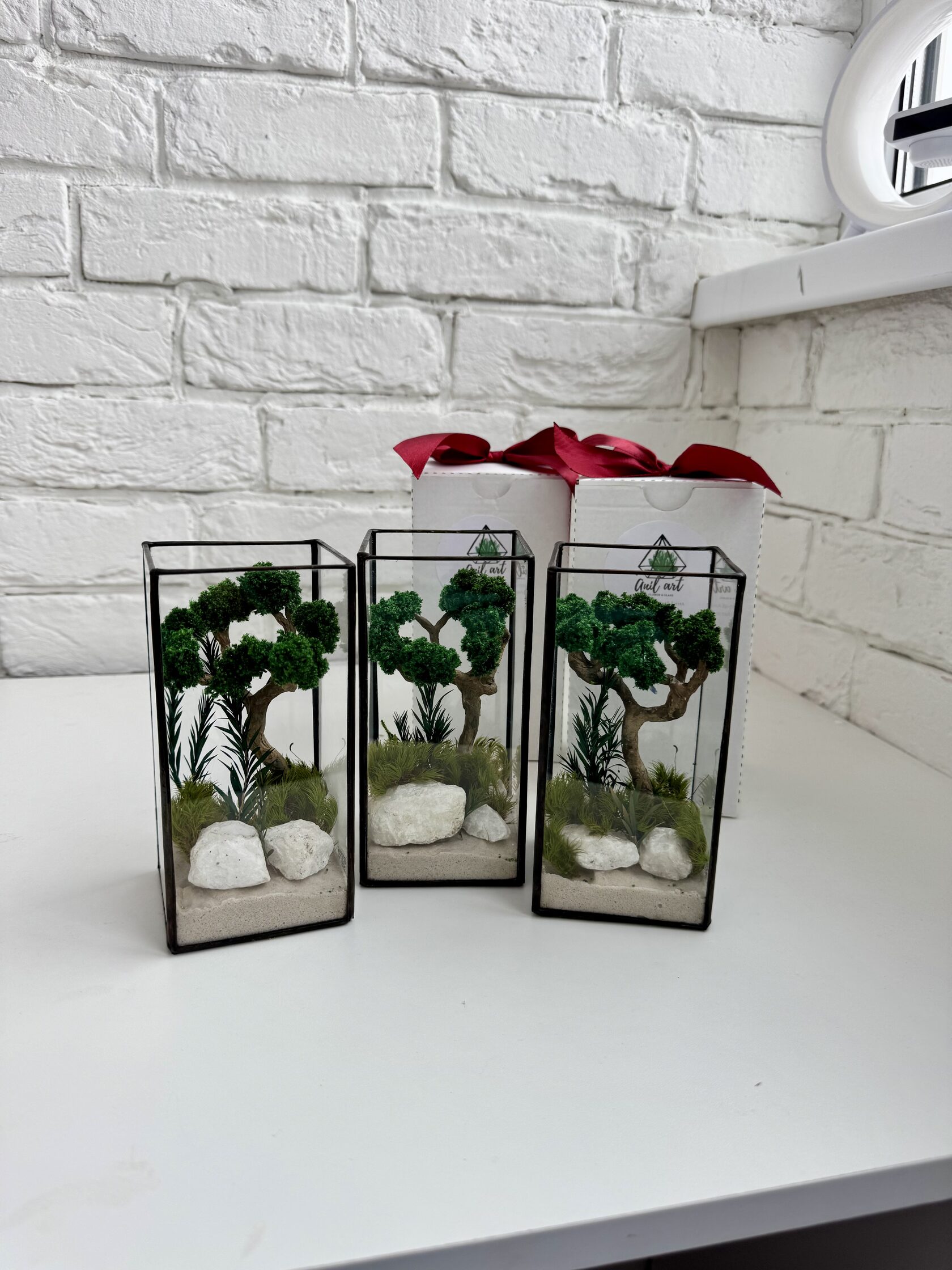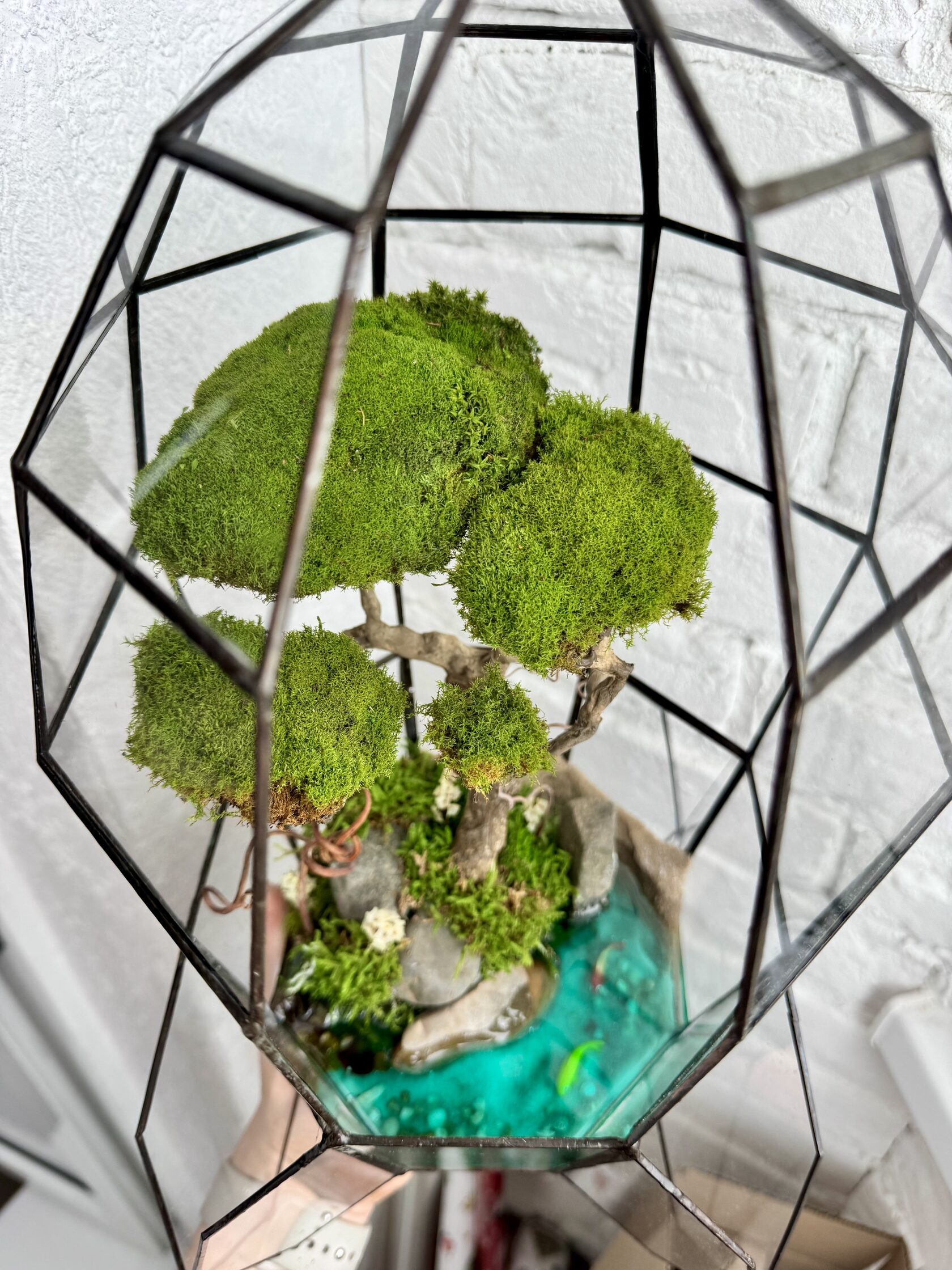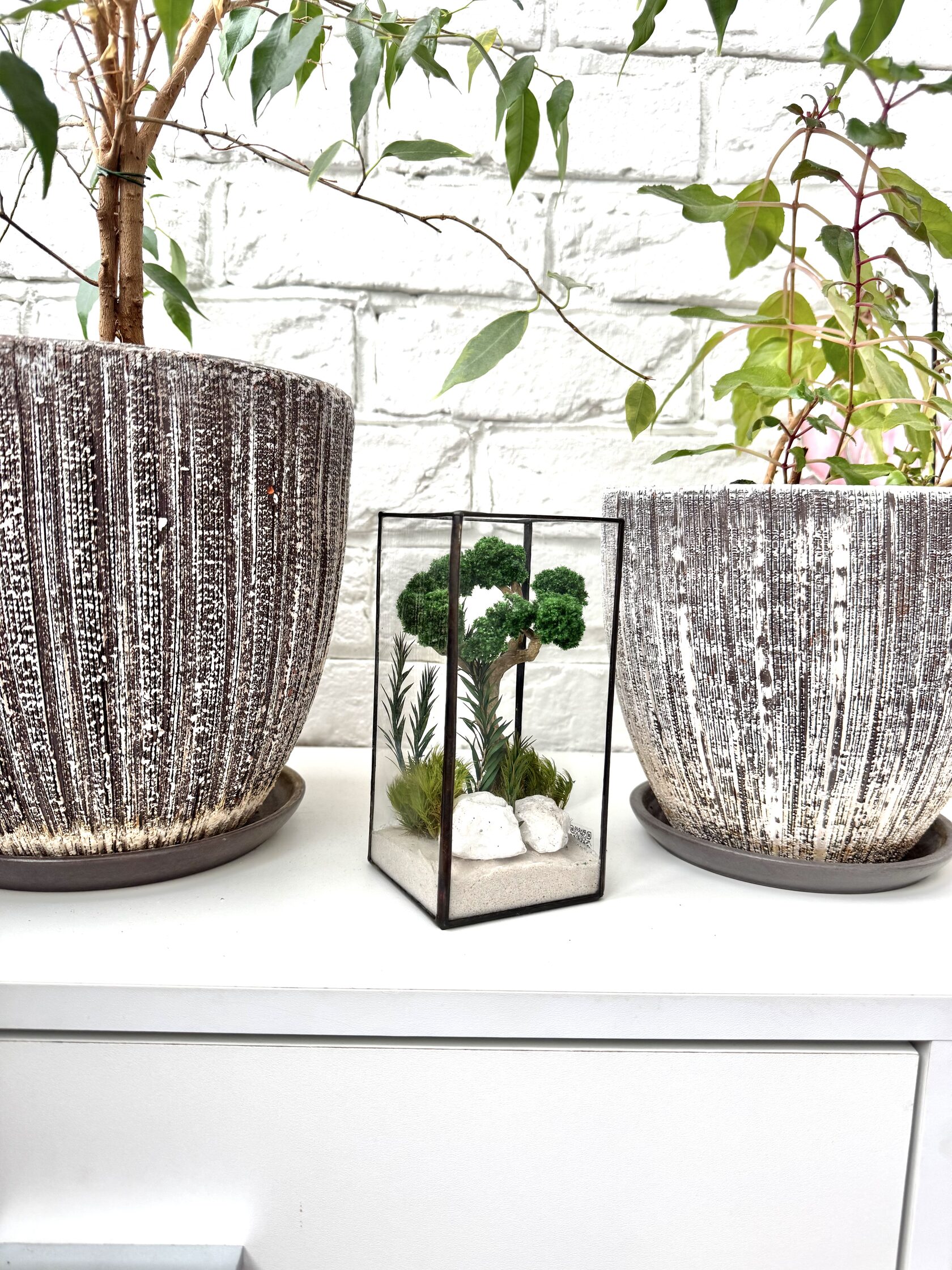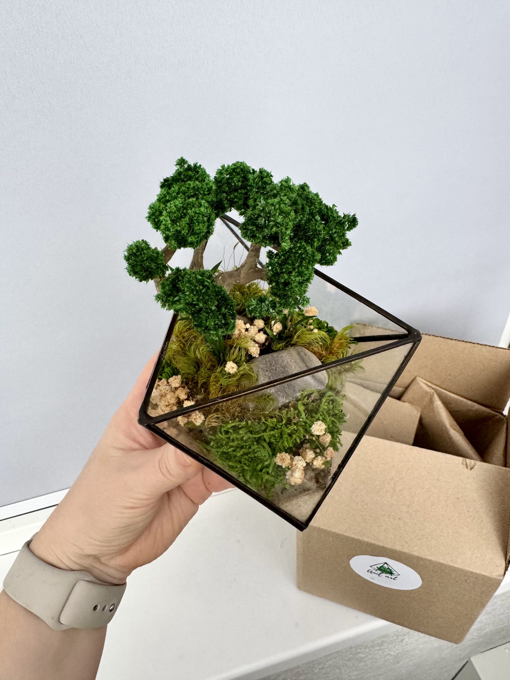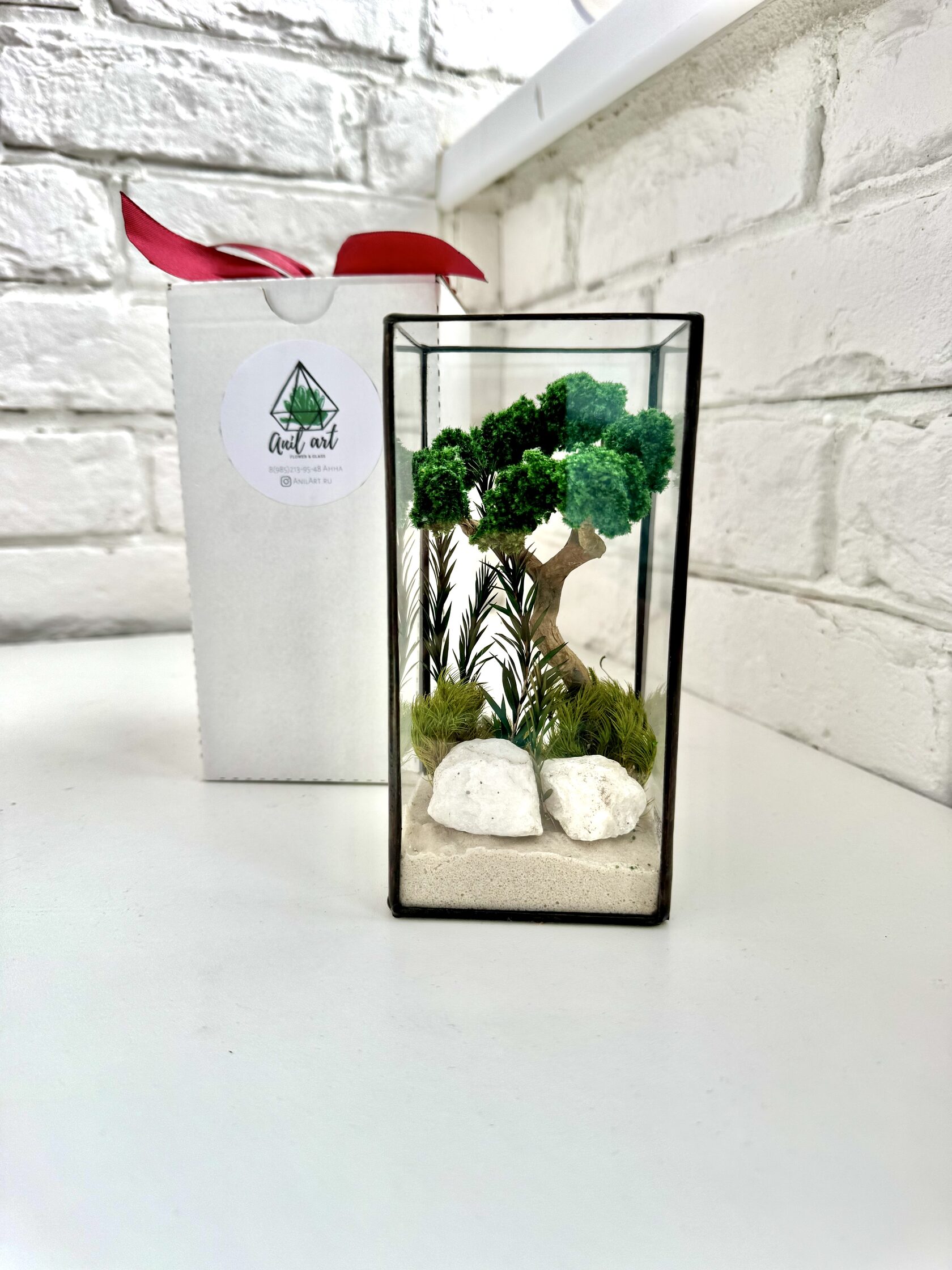 Моссариум — это миниатюрный оазис спокойствия и красоты, который станет украшением любого интерьера. Этот очаровательный флорариум создан с любовью вручную мастером, а стабилизированный мох придает ему невероятно реалистичный и умиротворяющий вид. Моссариум не требует особого ухода, он прекрасно впишется в любой дизайн и добавит нотку свежести и природной гармонии в ваш дом или офис.