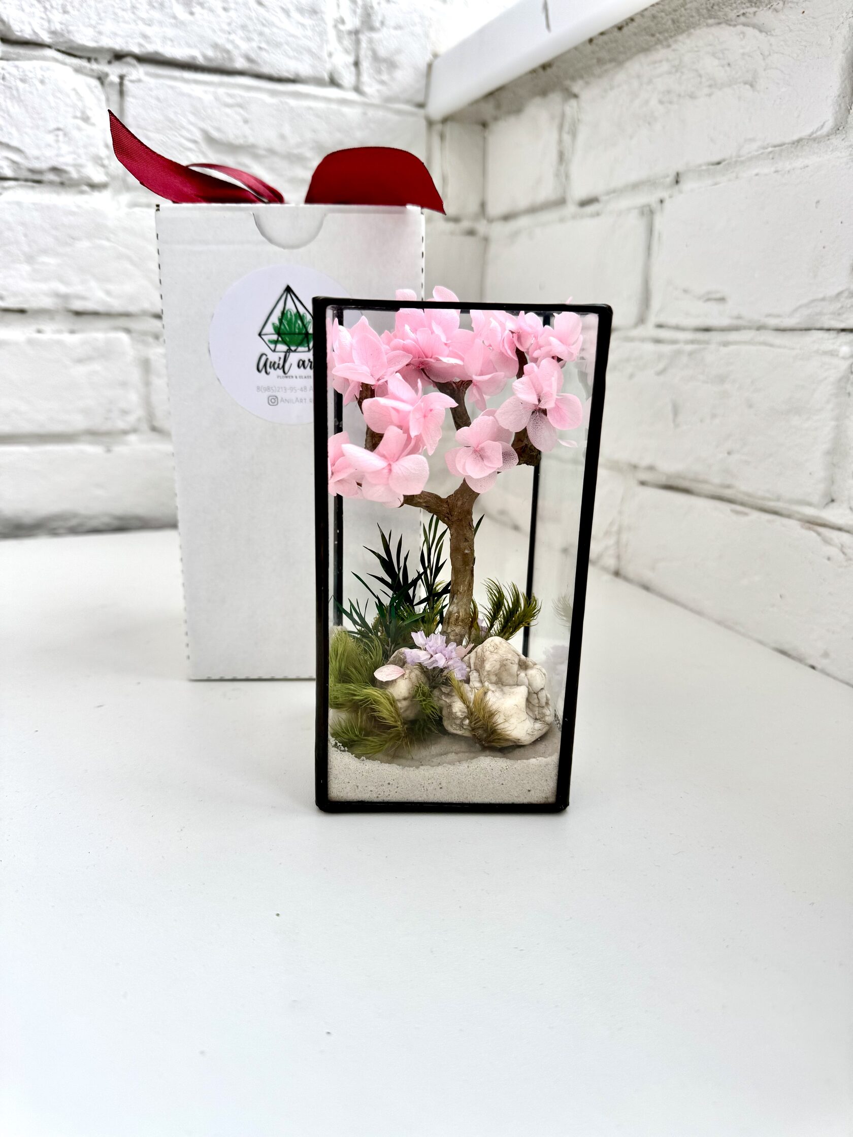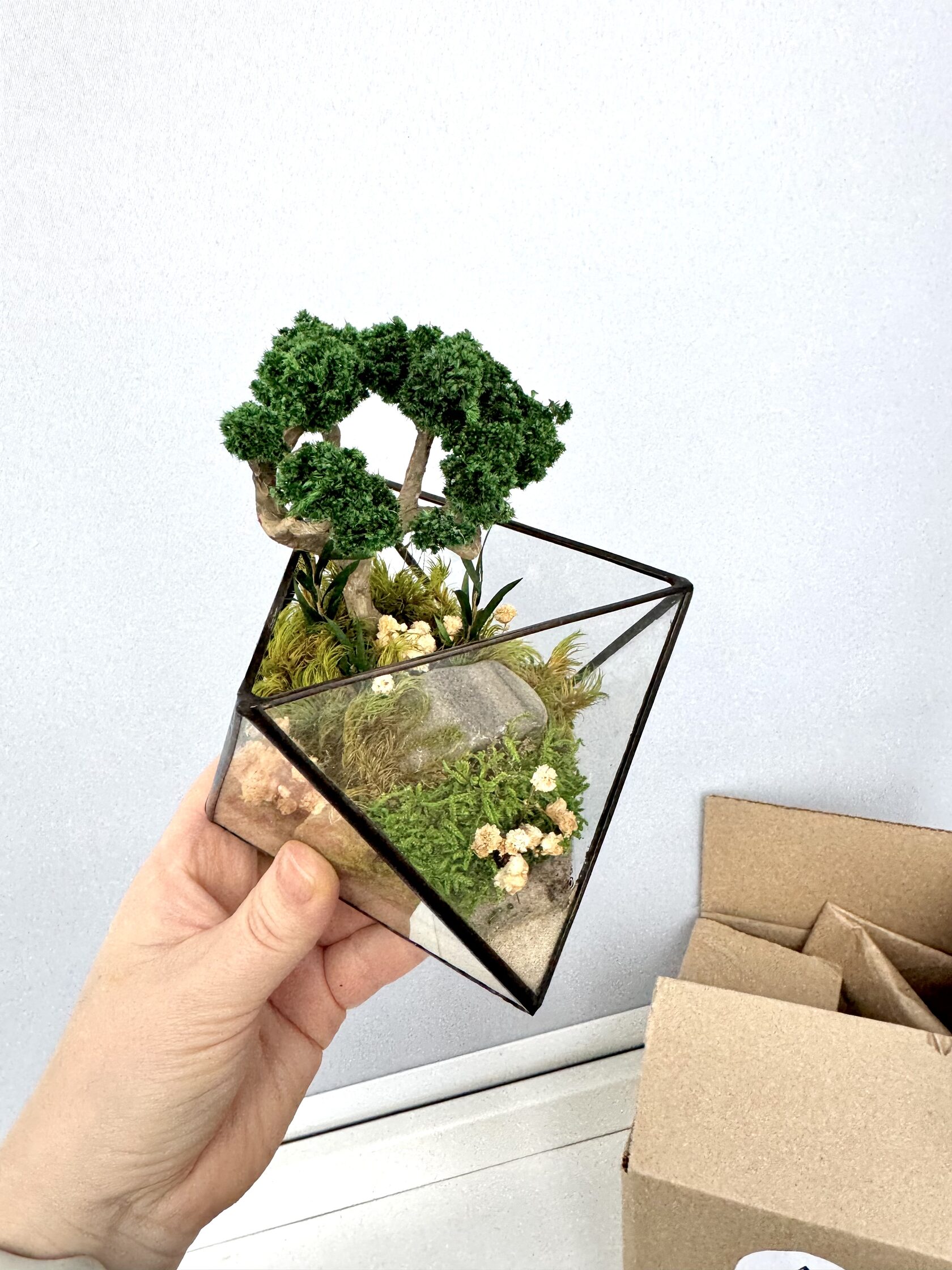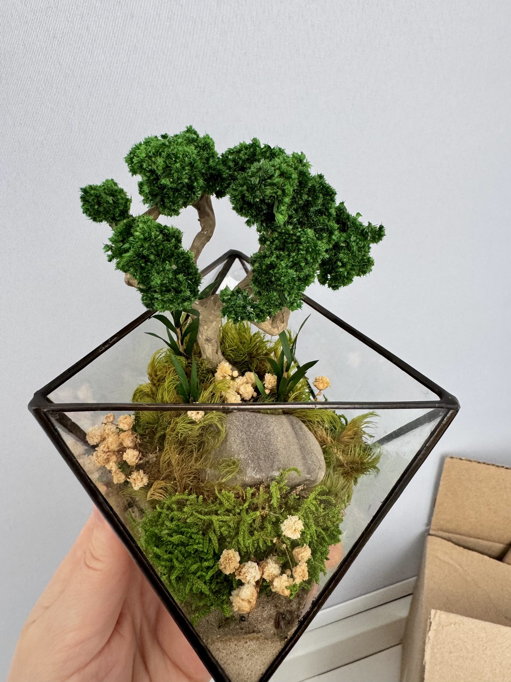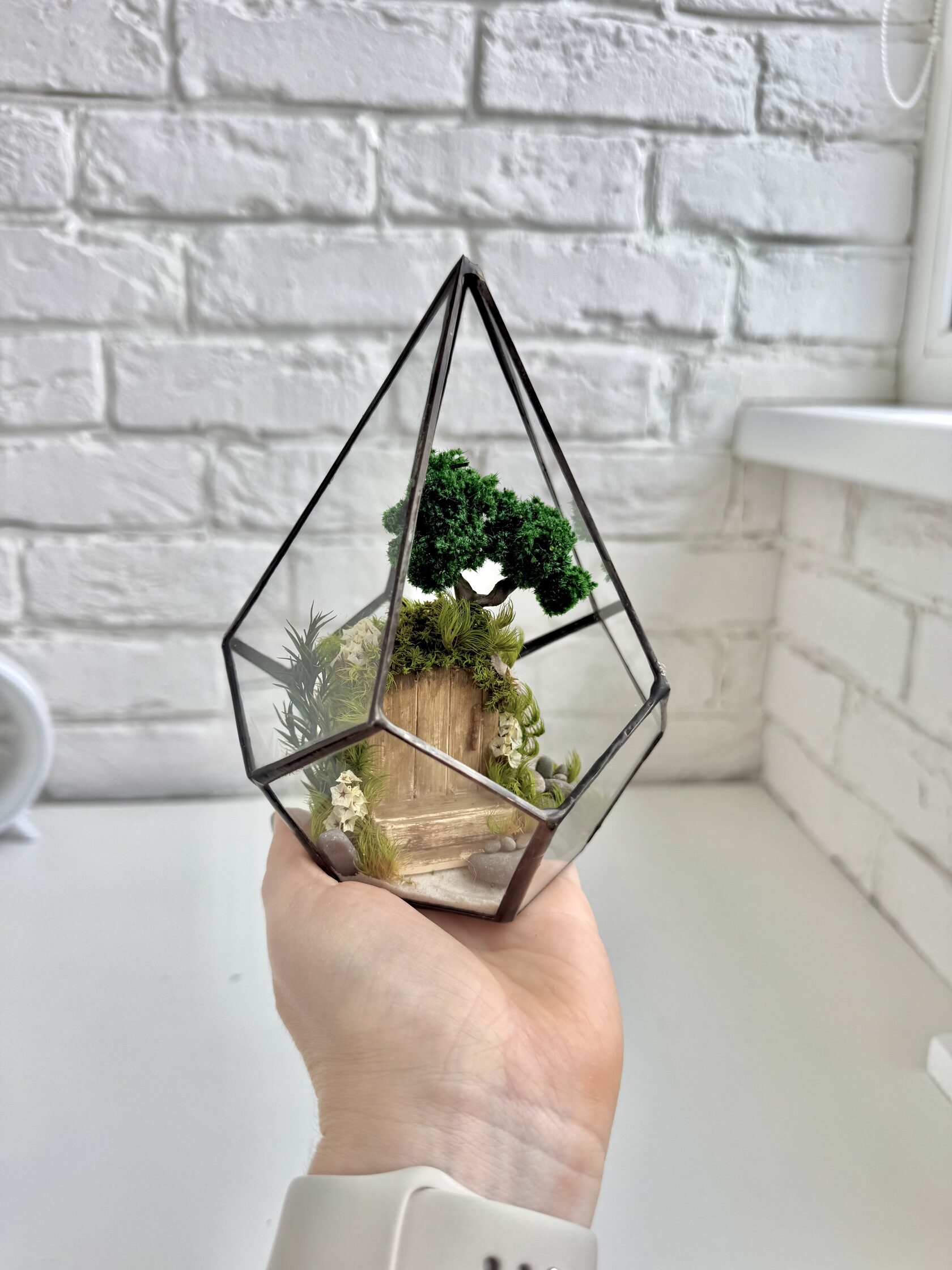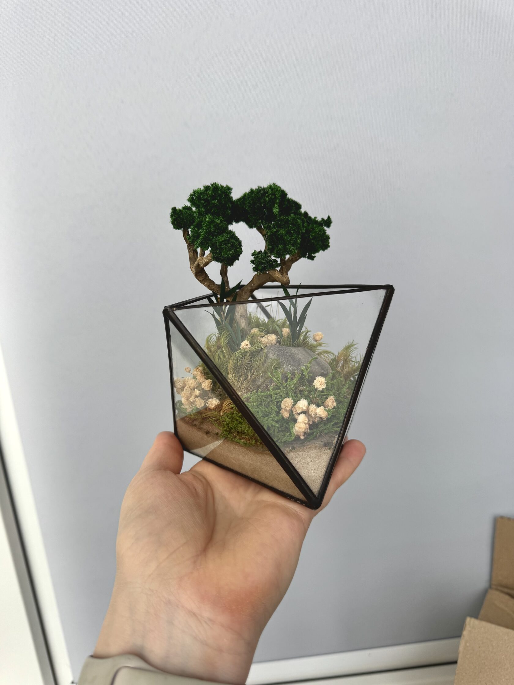 Моссариум — это миниатюрный оазис спокойствия и красоты, который станет украшением любого интерьера. Этот очаровательный флорариум создан с любовью вручную мастером, а стабилизированный мох придает ему невероятно реалистичный и умиротворяющий вид. Моссариум не требует особого ухода, он прекрасно впишется в любой дизайн и добавит нотку свежести и природной гармонии в ваш дом или офис.