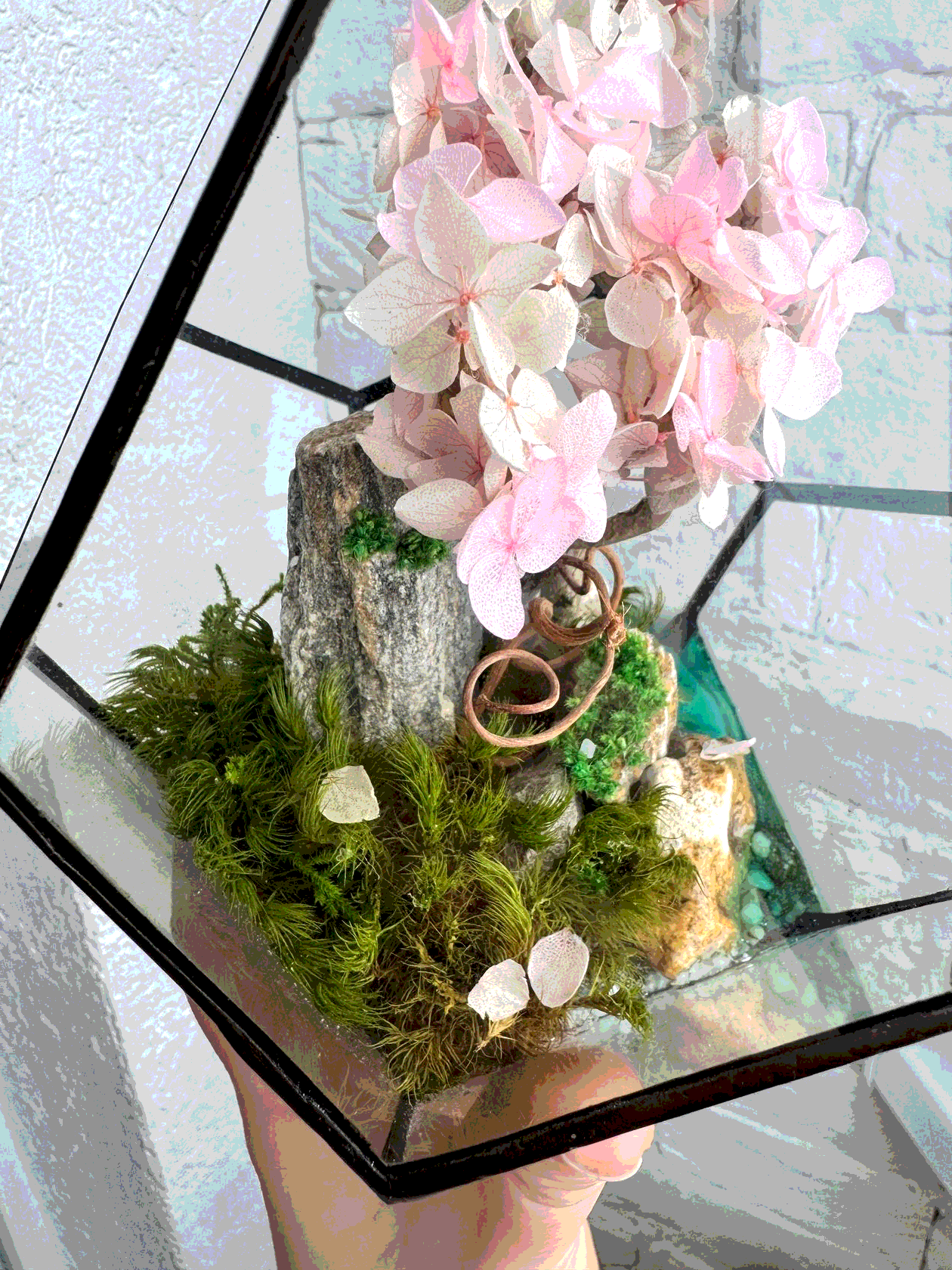 Вся забота о моссариуме - это протирать стекло от пыли. Выполнен в закрепленной технологии, поэтому так удобно его доставлять в любые уголочки России.